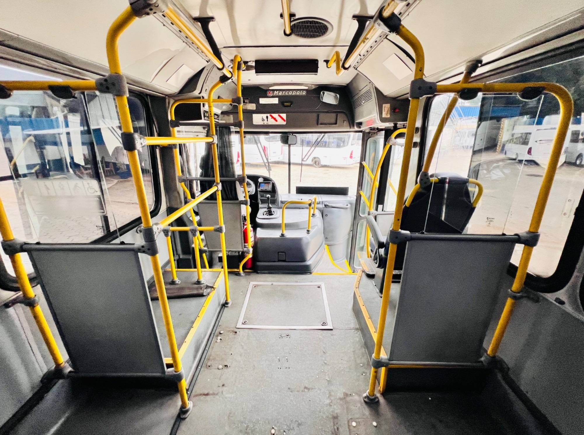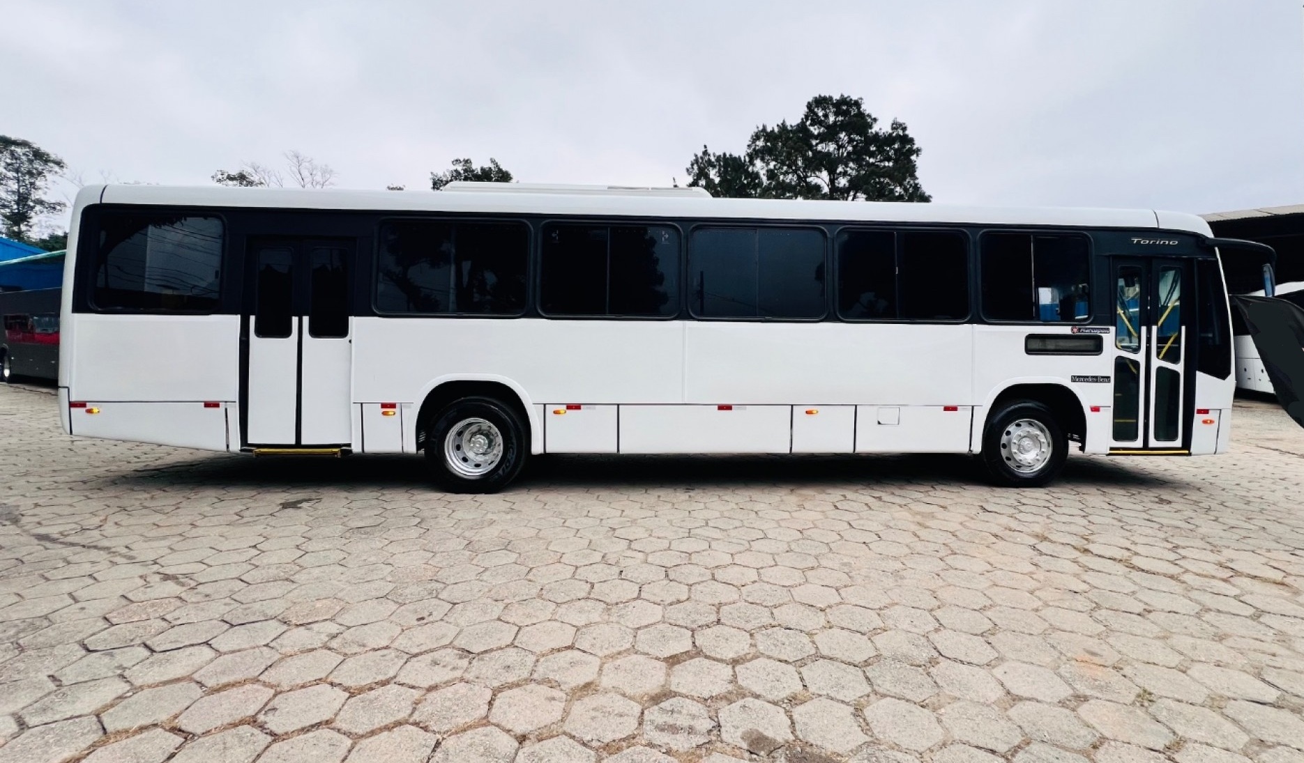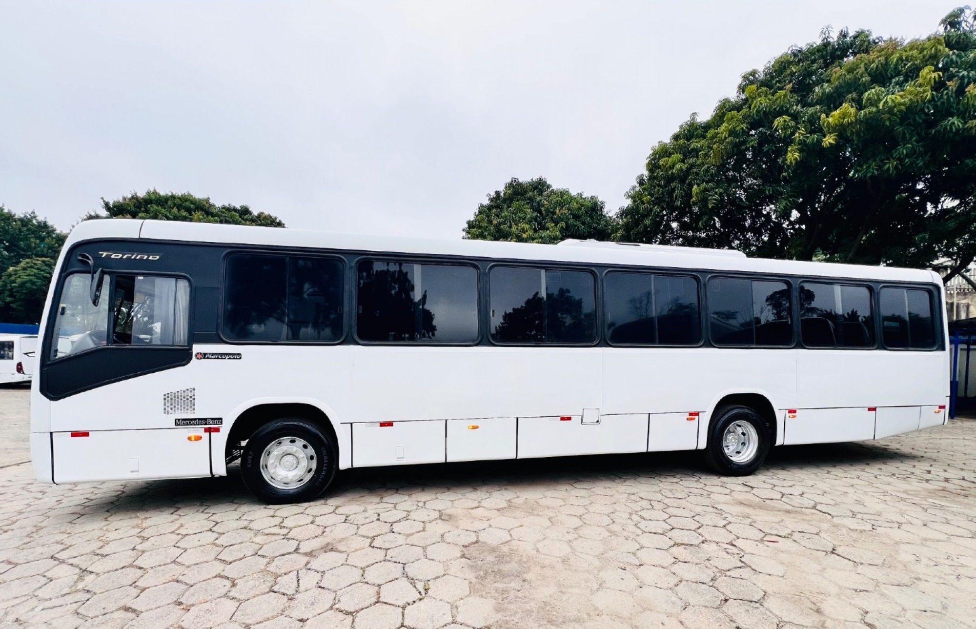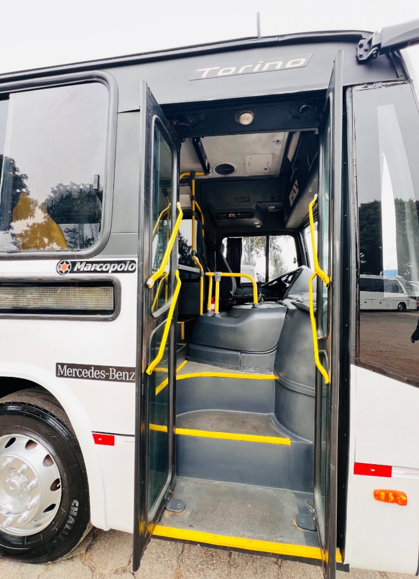 Ônibus Urbano Marcopolo New Torino, mecânica Mercedes-Benz 1721 dianteiro, ideal para transporte urbano e linhas regulares. Equipado com 41 bancos fixos estofados, duas portas, piso em alumínio revestido em taraflex e sistema de acessibilidade com elevador traseiro.