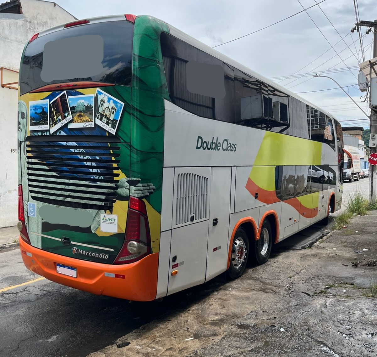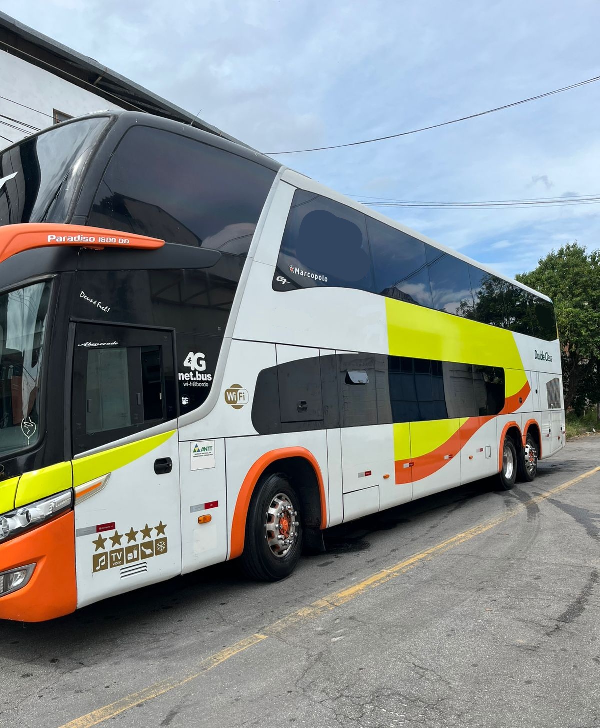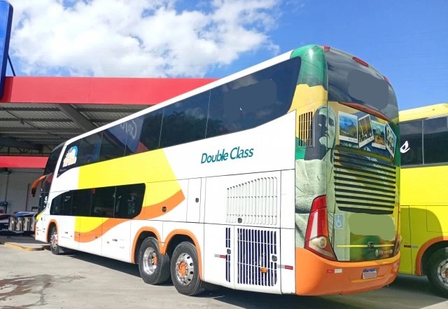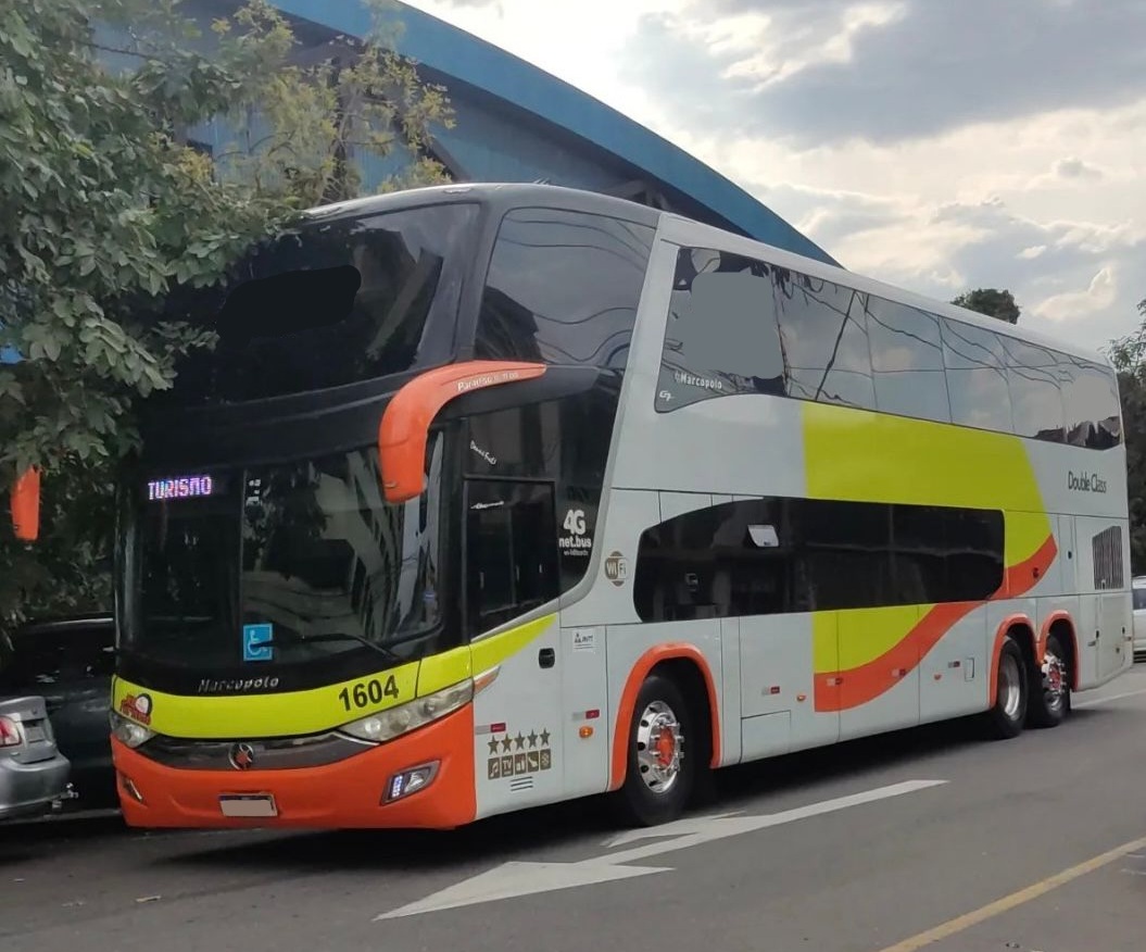 O ônibus Marcopolo Paradiso 1800 DD conta com estrutura completa para transporte executivo, incluindo banheiro (WC), vigia traseiro, geladeira elétrica e excelente distribuição interna nos dois andares.