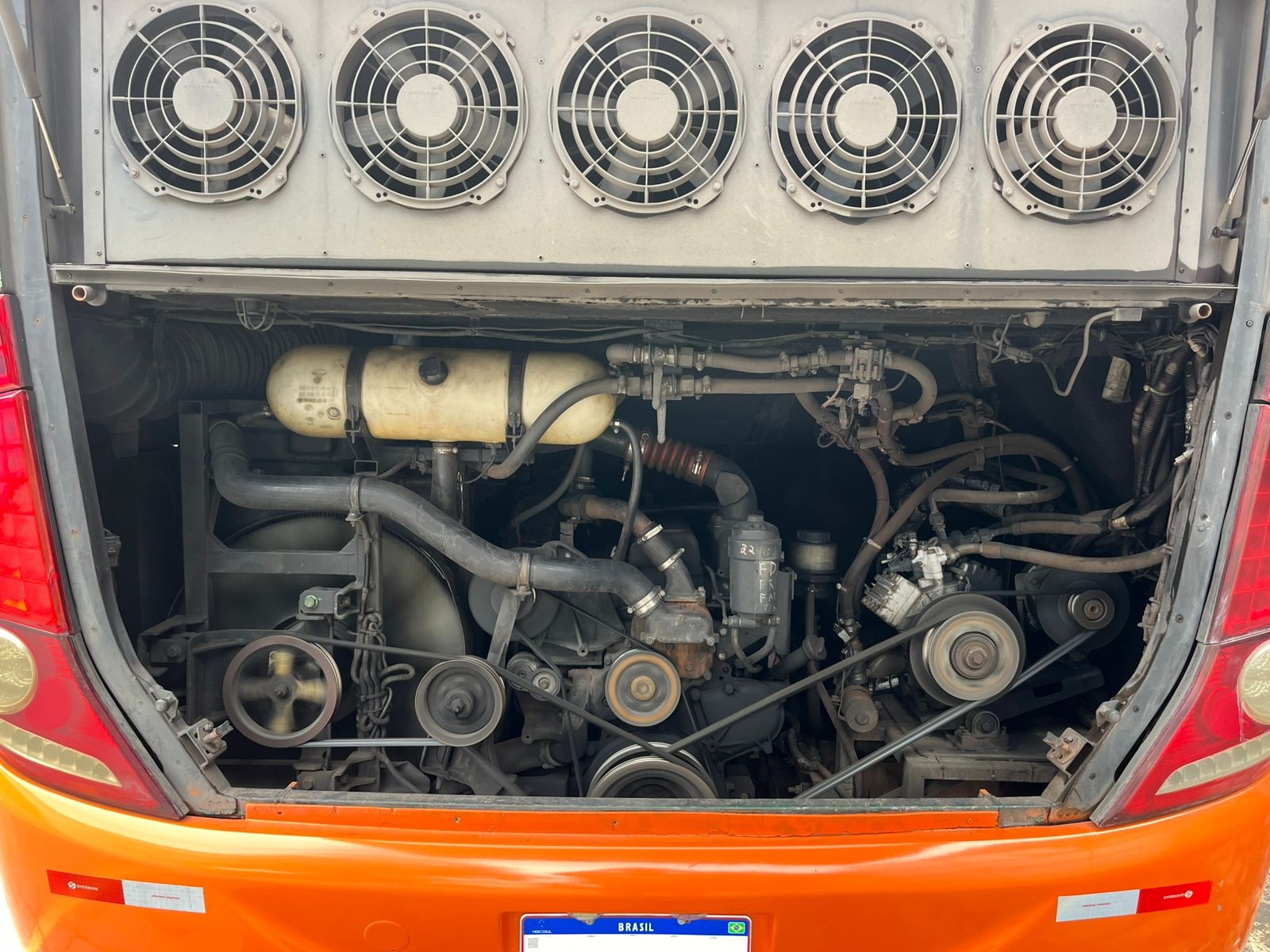 Motor Mercedes-Benz OM-457 LA, com 6 cilindros em linha, sistema turbocooler.