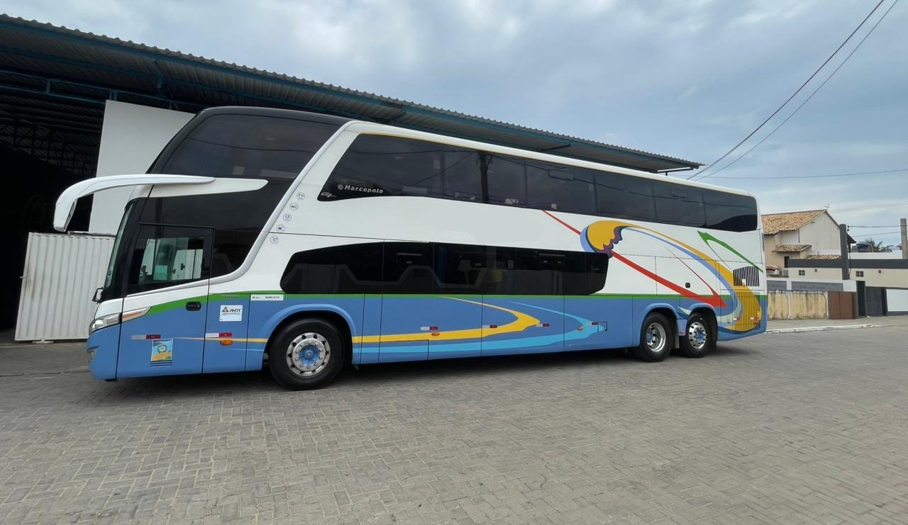 Ônibus Marcopolo DD G7 para turismo, com acabamento premium e alto nível de conforto e segurança. Equipado com WC químico, geladeira elétrica, vigia traseiro, monitores de TV LCD com DVD, som ambiente com microfone, tomadas USB, itinerário eletrônico em LEDs branco, cama para motorista auxiliar, interior totalmente acarpetado, ar-condicionado revisado e gelando, janelas com vidros colados e escurecidos originais.