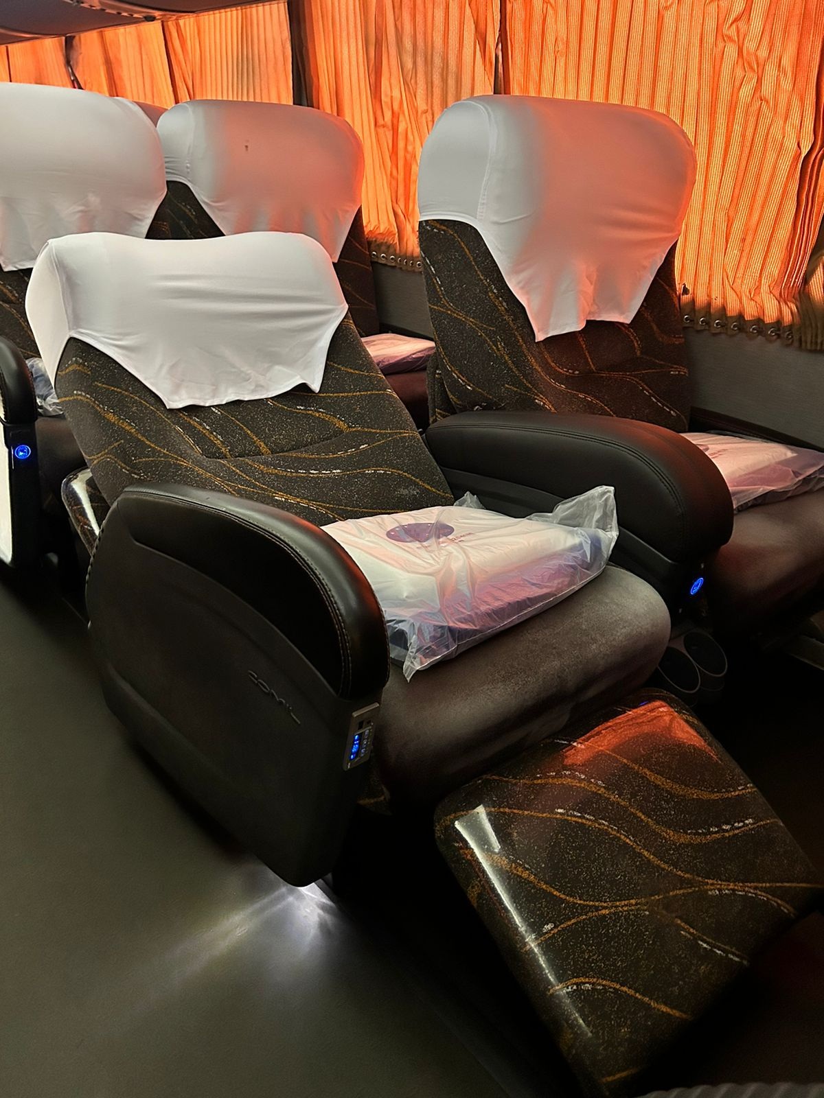 Configuração interna com 33 poltronas leito no piso superior, todas com descanso de pernas, e 14 poltronas no piso inferior, totalizando 47 lugares, oferecendo elevado nível de conforto para viagens de média e longa distância. Ônibus completo, revisado, pronto para operação imediata e com documentação regular para transferência.